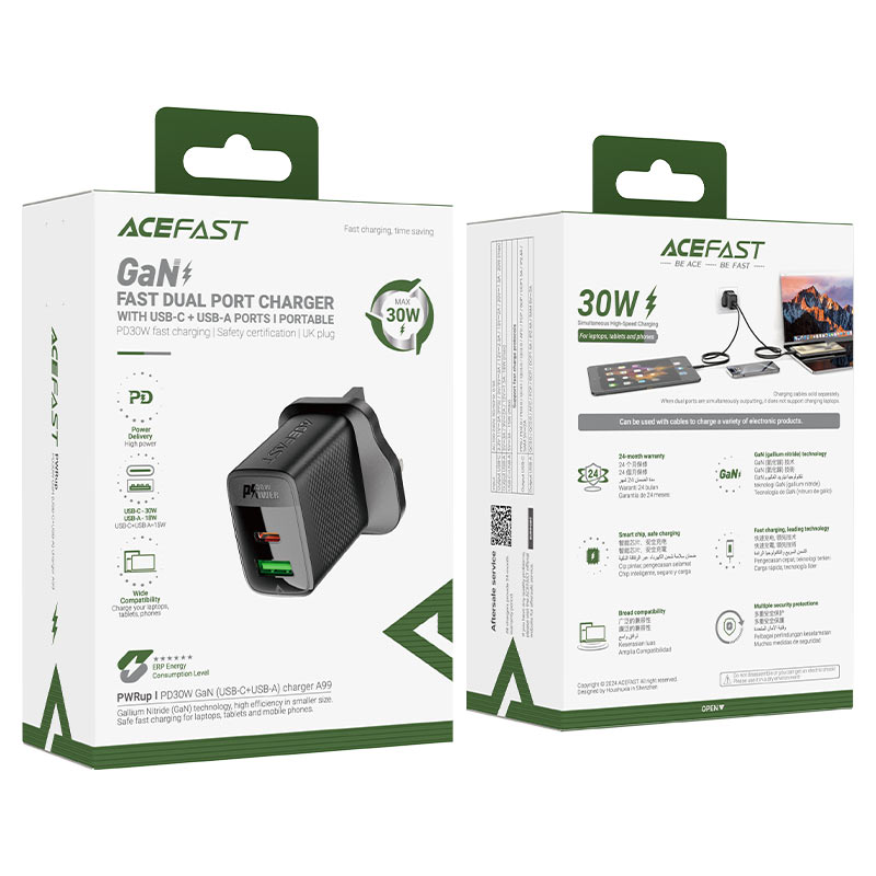 شاحن جداري ثنائي المخرج أ99 من أيس فاست (تايب سي+تايب ا) 30واط | AceFast Fast Charge Wall Charger A99 PD30W (USB-C+USB-A)