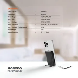 بطارية الشحن من بورودو بسعة 10000 مللي أمبير مع كابل تايب سي مدمج وحامل هو أفضل جهاز شحن لجميع أجهزتك. تحتوي على سعة بطارية ضخمة تبلغ 10000 مللي أمبير يمكنك الاعتماد عليه دائمًا عندما تحتاج إلى بطارية الشحن. تدعم الإخراج اللاسلكي عدة خيارات لسرعة الشحن: 5 واط، 7.5 واط، 10 واط، و15 واط. تدعم إدخال وإخراج تايب سي ويشحن بسرعة 18 واط عبر تايب سي، مع إخراج خط تايب سي بقوة 20 واط. تحتوي بطارية الشحن على حامل آمن مع تثبيت مغناطيسي قوي، مما يحافظ على الجهاز في مكانه أثناء الشحن. سواء كان ذلك لإعادة شحن سريعة أو محطة شحن محمولة، توفر بطارية الشحن بورودو حلاً فعالًا ومريحًا جدًا لجميع متطلبات الشحن الخاصة بك.