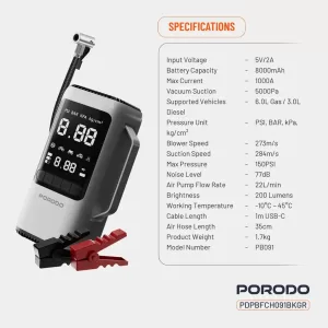 أداة بورودو الكهربائية متعددة الوظائف 6 في 1 هي أداة عملية وملحق سيارة يُلبي العديد من الأنشطة. بسعة 8000 مللي أمبير/ساعة وتيار أقصى يبلغ 1000 أمبير، وهي مصممة لتشغيل السيارة، وتنظيفها بالمكنسة الكهربائية، ونفخ الإطارات، وشحن البطاريات، ونفخ الإطارات، وإضاءة مصابيح الطوارئ. تدعم هذه الأداة المركبات التي تعمل بمحركات تصل سعتها إلى 6.0 لترات بنزين أو 3.0 لترات ديزل، ويبلغ أقصى ضغط لمضخة الإطارات 150 رطل/بوصة مربعة. تصل قوة شفط التفريغ إلى 5000 باسكال، وتصل سرعة النفخ إلى 273 مترًا في الثانية، مما يوفر قوة تنظيف ممتازة. لسهولة الاستخدام، تأتي الأداة الكهربائية مع كابل تايب سي بطول متر واحد وخرطوم هواء بطول 35 سم. أما من حيث السطوع، فيُصدر الجهاز 200 لومن، وهو مثالي لحالات الطوارئ. بفضل قدرتها على العمل في درجات حرارة تتراوح بين -10 درجات مئوية و45 درجة مئوية، تُعد أداة بورودو 6 في 1 ضرورية لكل مركبة، حيث توفر سهولة الحمل والاستخدام لجميع احتياجات سيارتك. المواصفات: