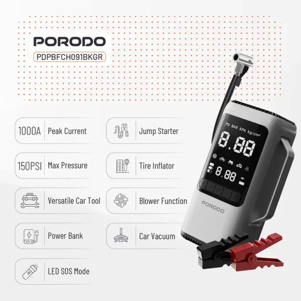 أداة بورودو الكهربائية متعددة الوظائف 6 في 1 هي أداة عملية وملحق سيارة يُلبي العديد من الأنشطة. بسعة 8000 مللي أمبير/ساعة وتيار أقصى يبلغ 1000 أمبير، وهي مصممة لتشغيل السيارة، وتنظيفها بالمكنسة الكهربائية، ونفخ الإطارات، وشحن البطاريات، ونفخ الإطارات، وإضاءة مصابيح الطوارئ. تدعم هذه الأداة المركبات التي تعمل بمحركات تصل سعتها إلى 6.0 لترات بنزين أو 3.0 لترات ديزل، ويبلغ أقصى ضغط لمضخة الإطارات 150 رطل/بوصة مربعة. تصل قوة شفط التفريغ إلى 5000 باسكال، وتصل سرعة النفخ إلى 273 مترًا في الثانية، مما يوفر قوة تنظيف ممتازة. لسهولة الاستخدام، تأتي الأداة الكهربائية مع كابل تايب سي بطول متر واحد وخرطوم هواء بطول 35 سم. أما من حيث السطوع، فيُصدر الجهاز 200 لومن، وهو مثالي لحالات الطوارئ. بفضل قدرتها على العمل في درجات حرارة تتراوح بين -10 درجات مئوية و45 درجة مئوية، تُعد أداة بورودو 6 في 1 ضرورية لكل مركبة، حيث توفر سهولة الحمل والاستخدام لجميع احتياجات سيارتك. المواصفات: